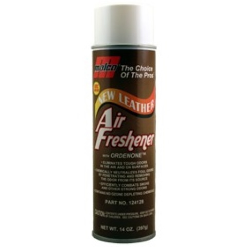 Malco New Leather Air Freshener is a water based deodorizer that will remove most unpleasant odors immediately and effectively. This unique molecular formulation encapsulates foul odors and renders them ineffective on contact. Safe and effective for use on automotive interiors, carpet, upholstery, furniture, draperies, bedding, most clothing, waste cans, pet odor and smoke.